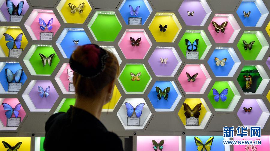 4月22日,一名参观者在蝴蝶标本展览馆内欣赏标本。当日,位于长沙市望城区白箬铺镇光明村的湖南首家蝴蝶文化主题公园——光明蝶谷日前完成布展,首次对媒体开放,并将于5月1日面向公众正式开放。据介绍,光明蝶谷是湖南首家集蝴蝶饲养、昆虫研究、科普教育、观赏摄影、蝴蝶工艺等于一体的蝴蝶文化主题生态公园,园区占地600余亩,饲养有凤蝶科、斑蝶科、蛱蝶科、粉蝶科等8个科属20余种名优蝴蝶。新华社记者 白禹 摄