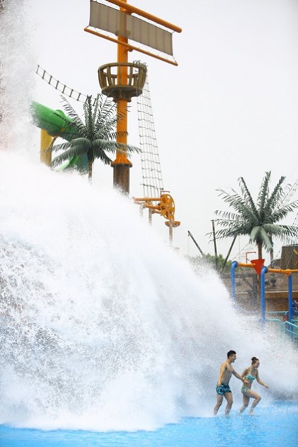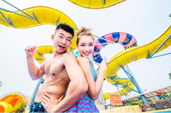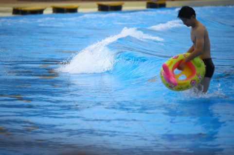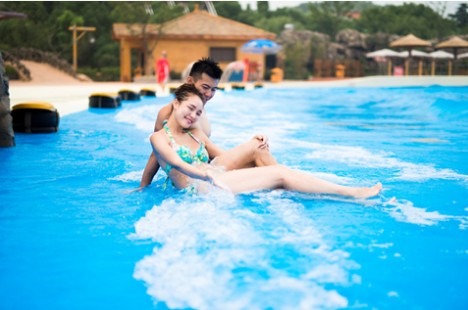 天目湖水世界的中心有一个巨大的造浪池,名曰“超级台风”,占地2800平方米,非常辽阔。上海并不缺少开阔的海滩,缺少的是清澈的海水。然而,这里的水清澈见底,碧蓝剔透,犹如完美的蓝宝石一般晶莹无暇。波浪一波一波冲刷过来,拍打在沙滩上。女友靠在我的肩膀上,我们的身体随着波浪有节奏的晃动。7月的阳光照在我身上,却不再毒辣,让我突然有一种坐在澳大利亚大堡礁海滩边的幻觉。天目湖水世界让我的夏天清凉而甜蜜。