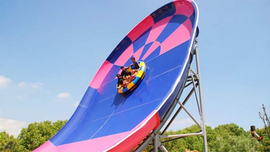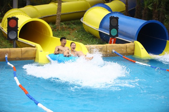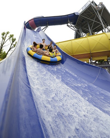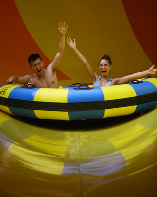 登上最高处的出发台,我们坐到了充气皮艇里。一开始坡度很缓,我们顺着水流向前缓缓滑动。在转了两个蛇弯之后,坡突然陡起来,水流载着我们顺着超过50°的大斜坡急冲直下,就好像要从8层楼上飞跳下去一般。女友大惊失色,吓得紧抓住我,闭上眼睛大声尖叫,我也紧张的死死抓住皮艇不敢松手。“唰”的一下,我们冲到滑道底端,皮艇前端击打出无数白色的水花。
