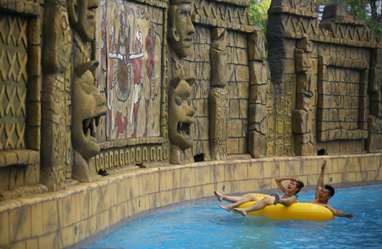 前面坡陡起来,水流开始加速了,然而我们刚体验过惊险刺激的巨蟒,在这种速度下并不觉得紧张,怀着舒畅的心情穿梭其间。忽然,水道改变了方向,一个直角弯转过去,一片开阔的水域豁然展现在眼前,抬头一看,我们竟然一下撞进了玛雅“遗址”里。一堵高耸的玛雅文化墙矗立在面前。断壁残垣上红黄的颜料画着古代印第安人的精美壁画,一位酋长端坐中间,侍从们前呼后拥,伴随着他出行。墙上的浮雕展示了酋长的威严,旁边雕刻着玛雅人的远古文字,似乎在诉说着这位酋长的伟大功绩。奇幻的漂流,文化的冲击,在时空穿越中,让我们感受到了不一样的心旷神怡。