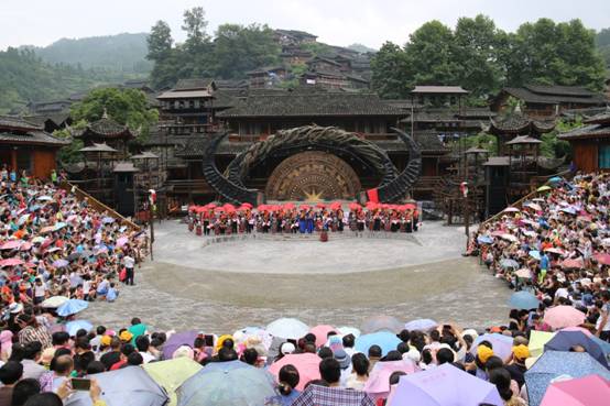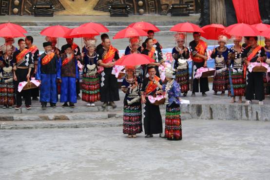 两寨佬在西江表演场为新郎新娘证婚 最后在西江千户苗寨最有威望的老人,寨老的见证下,主持人带领百对情侣爱的宣言,为这百对情侣印证婚姻誓言。 |