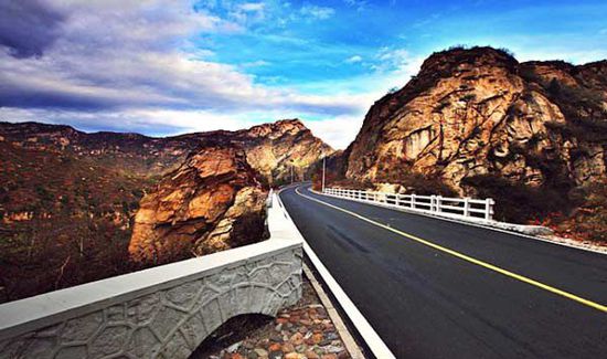 道路黑亮,山谷阑珊,河床蜿蜒,远山寂淡……两侧一派深秋的色彩,红叶恣意地堆叠在公路两旁,爬山虎、火炬树、大白杨都如火似蜡,层层如画。一阵秋风吹过,五彩的落英如雨,那些旋转的灿烂,就如同是在画廊里舞蹈的秋之精灵,在车窗外演绎着动人的华尔兹,绚烂的离别,将会是重生的起点,来年的四月,繁花与绿色,将点缀着这山谷静悄悄的春天。秋色最迷离的一段,是云蒙仙境附近的山峦,奇峰林立,河流倒转,山林绚烂,这里非常值得你停下来,驻足徘徊。当时因为急着赶路,我们并未在云蒙仙境停车,错过了峡谷最美的秋色,有些遗憾。