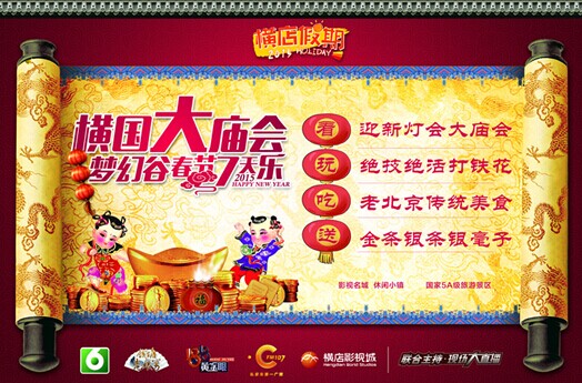 去横店过红红火火的春节 金砖银币,随意炫富 怎么才算有钱?金砖铺地,算不算?遍撒银币,算不算? 在策划活动方面,横店影视城向来有股不惜成本、不计得失的“土豪气”,今2014年暑期狂砸800万元做了“八年庆”系列活动,至今仍沉浸其中。2015年春节活动,他们又再出大手笔,直接和真金白银杠上了。 黄金大道 别以为“黄金大道”只是个俗气的名字而已,这回横店影视城是真的“俗”了。正月初五这天,在梦幻谷的儿童梦工厂广场,18.18米的“黄金大道”直接沿地铺开。这条黄金大道是名副其实的“黄金”大道,在特制的玻璃展柜内,18.18米的长度全部由999千足金金砖铺设而成。中国人都有求财运的习俗,尤其是春节,踩踩黄金,可转财运、聚财气。 横国通宝 “横国通宝”不是别的,是由千足银制造的银毫子。分大银毫和小银毫两种。本次春节活动,横店影视城共准备了20万个大小银毫,堆起来犹如一座银山。这些银毫将全部免费赠送于游客。除此之外,还有重量不等的纯银质地的银条、银牌平安符数十个,也将在春节期间免费送出。 除金砖银币外,梦幻谷还准备了重量及数量不等的金条、银条、金苹果,以及以“千”、“万”计量的金蛋、福袋、红包等小礼品。光礼品金额就达百万元。