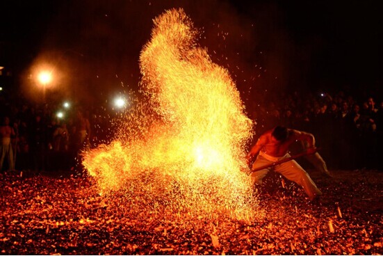 横国大庙会,春节7天乐 横国大庙会,热闹年味少不了 光顾着炫富和任性了,都忘了说正事了。其实,今年横店影视城春节活动的主题全称叫“横国大庙会,春节七天乐”。这个才是今年春节的干货。 春节大庙会,热闹是必须的,年味也是一定要有的。那横国的大庙会有什么特色,热闹到什么地步呢? 庙会老把式 庙会必定要有把式,绝技杂耍、舞乐百戏是传统老庙会的“当家项目”,对庙会印象最深的仍是儿时记忆中的那些奇门绝技。今年春节七天,横店影视城邀请了来自“天下杂技第一乡”吴桥的杂技团队前来表演。吴桥杂技以惊险奇绝著称,此番他们的表演多为南方并不太常见的杂耍,部分项目都是国家级非物质文化遗产。其中,又以“打铁花”为甚。 打铁花 “打铁花”是一项古老的民俗娱乐活动,又叫“打铁水”。就是将经过高温烧化的铁水,倒入特制的容器中,再以爆发式的力量,将其打向天空,顿时,铁水变化成耀眼的花雨,如天女散花一般,形状千变万化,在夜空中灿烂夺目。它形如烟花,又不同于烟花。这项绝技危险与惊艳并存,对艺人的身体条件和技术要求尤其高,其所用的铁水最高能达到一千摄氏度的高温,艺人们必须要用尽全力击打,追求铁水的高和散,让铁水变成微小的铁屑在空中燃烧冷却,才不会造成烫伤。如果力度不大,或者打击的位置不准确,铁水没有完全散开,铁花飞跃的高度也会有限,除了打出的铁花不美观之外,还极易烫伤自己或他人。因此,“打铁花”必须要有充足的体力和熟练的技术才行。“打铁花”这项千年绝技,犹如中国众多非物质文化遗产一样,濒临失传,除了偶尔在北方集镇的春节元宵集会上才能见到。今年春节,游客有幸可以在横店一睹其火树银花、流光溢彩的盛景。