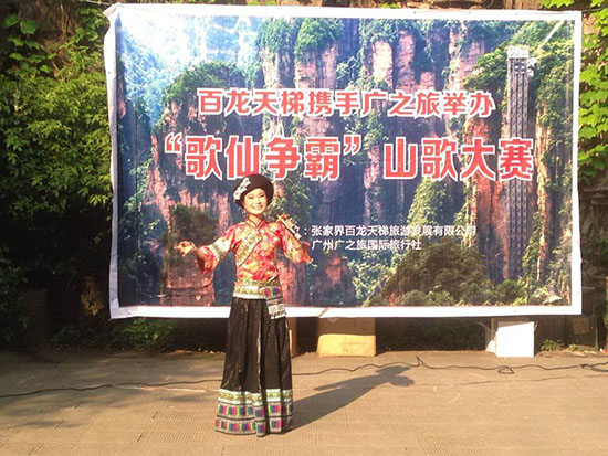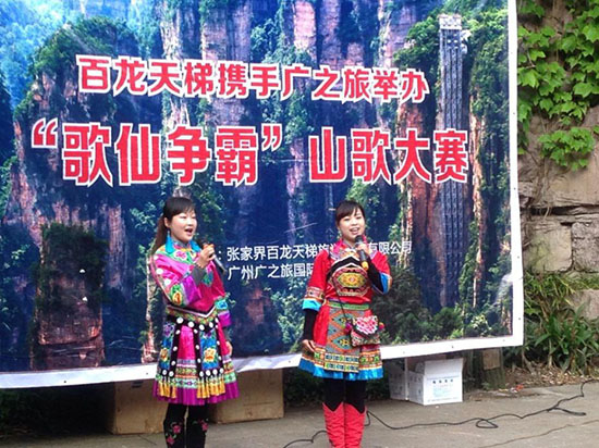 时间:2015-05-10 11:28:29 来源:不详 农历三月三是汉族及多个少数民族的传统节日, 古称上巳节(又称“女儿节”),这一日,是土家族的情人节,节日当天,土家族的阿哥阿妹聚在一起,以山歌为媒,以踩脚定亲。为更好的展现大湘西土家族、苗族及湘西凤凰地区大山人民农耕文化及土家民俗。4月26日张家界百龙天梯携手广之旅隆重举办“歌仙争霸——对山歌大赛”。