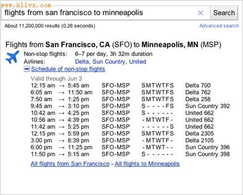 时间:2011-5-30 11:59:33 来源:腾讯科技| 据国外媒体报道,Google软件工程师皮特·韦杜姆(Petter Wedum)周五在Google搜索部门官方博客中宣布,Google已经将航班信息整合到Google搜索结果当中。