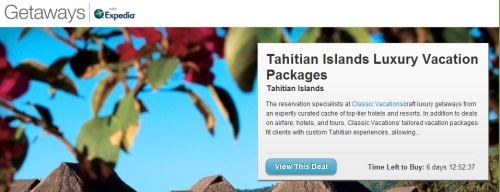 最初提供的产品种类繁多,从拉斯维加斯棕榈树赌场大酒店89美元的两人一晚住宿(包含全天通行证,赌场积分以及两人自助早餐),到泰国[注: 泰国,全称泰王国,别名:夳国。是东南亚的一个国家,东临老挝和柬埔寨,南面是暹罗湾和马来西亚,西接缅甸和安达曼海。在1949年5月11日以前,泰国的名称是暹罗。]曼谷[注: 曼谷是泰国首都,东南亚第二大城市,主要港口和政治、经济、文化中心,被誉为是“佛教之都”。-mangu]Lebua Signature Suite的Tower Club的四人两个房间的五晚住宿(1497美元)。 在典型的团购销售方式中,你有大约一周的时间来购买产品,并且有最少的购买人数要求(使得产品生效)。 用户在网站上,首先会看到至少一个产品,并显示剩余交易时间,但现实中可能是不同的。 相比购买一个完整的酒店入住,以下这笔交易提供来自于Classic Vacations的售价500美元的 塔希提岛[注: 塔西提岛(Tahiti)南太平洋中部法属玻里尼西亚社会群岛中向风群岛的最大岛屿。同它最接近的是西北方20公里(12哩)处的莫雷阿岛(Moorea)。]度假套餐(标价1000美元)。Classic Vacations是Expedia旗下的一个品牌。