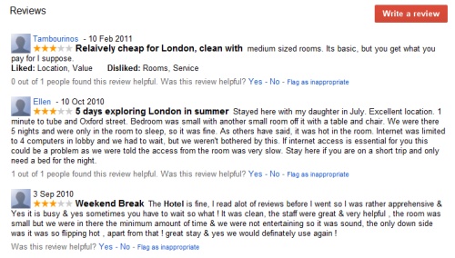 现在,当用户浏览Google Maps和Google Places上的酒店时,可以看到所有现有的内容(照片、地址、网站和价格),但是评论的数量锐减到几乎屈指可数。 在这之前,很多网站的评论(如TripAdvisor、Yelp、Igougo以及许多在线旅行社等)都会自动生成在酒店的Google页面上。 这种方式像TripAdvisor之类的公司很不满。TripAdvisor首席执行官 Steve Kaufer声称,这种评论显示的过程和方式“对消费者不利,对行业不利,对酒店和餐厅不利。” Google通过简单删除所有的这类评论而使这些公司消除了顾虑。Google产品管理总监Avni Shah在一篇博文中写道: “基于对Google Places页面未来发展方向的深思熟虑以及过去几个月我们收到的反馈,Google Places服务中移除了从其它网络公司获取的用户评论” 那么目前还出现在酒店页面的评论来自哪里呢?当然是Google会员。