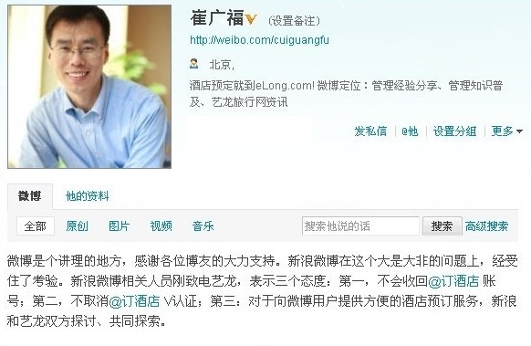 早前艺龙CEO崔广福发布微博质疑新浪相关人员向艺龙提出“要今日收回@订酒店”应用一事有了最新消息。 据@崔广福在其新浪微博的发言得知,新浪微博相关人员致电艺龙表示将不会收回@订酒店 账号及取消@订酒店 V认证。就此,3日下午2点01分,艺龙CEO崔广福在再次发布微博澄清该事。