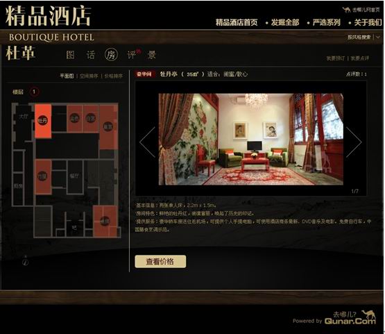 去哪儿网精品酒店频道可通过酒店平面图选择房型 目前,去哪儿网精品酒店频道收录了北京杜革四合院艺术精品酒店、平遥[注: 平遥县-平遥位于山西省中部,总面积1260平方公里,现辖14个乡(镇),总人口48万人。平遥古城距省会太原1OO公里,位置优越。]锦宅、丽江[注: 丽江是中国云南西北部的一座地级市。2002年全市总人口111万人。这是一座风景秀丽,也是中国罕见的保存相当完好的少数民族古城。]亿邦酒店、上海联艺·凯文公寓等等在内的近30家精品酒店,预计在今年年底前将覆盖国内200家精品酒店。 |