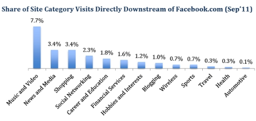 现在,旅游品牌利用Facebook打造品牌知名度,增强与消费者的互动并最终增加其自身网站的访问率和预订量,甚至有些品牌鼓励用户直接在他们的Facebook页面进行预订。 Compete分析了旅游品牌如何依赖于Facebook的流量与这些用户进行互动,并将旅游业与其他行业的数据进行了对比。 Compete得出的结论却不是很正面,尽管大多数旅游品牌在他们网站上和其他地方推荐了其Facebook页面。9月份,旅游网站通过Facebook获得的流量是830万,仅占总量的0.3%(总数为34亿)。这个超低的比例说明旅游与Facebook两者处于脱节的状态。除了搜索和邮箱以外,音乐、视频、新闻传媒和购物类网站是Facebook的主要上游和下游流量来源,只有0.3%的用户离开Facebook后浏览旅游网站。