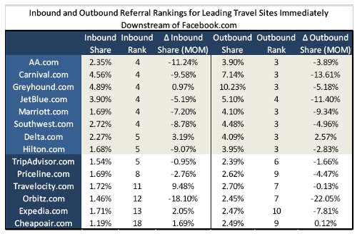 Compete还评估了Facebook通过主要旅游网站获得的(及给他们带来的)上游和下游流量的排名。与九月份的整体形势一致,几乎所有旅游网站给Facebook带来的上游流量环比都下降了。