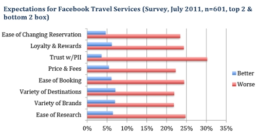 对于旅游,Facebook更像是为通过供应商购买的消费者(而不是通过OTA购买的消费者)提供的研究计划阶段。Facebook给供应商网站带来的流量排名平均是第四名,而给OTA网站带来的流量排名是第11名;通过供应商网站获得的流量排名是第3名,通过OTA网站获得的流量排名是第8名。 消费者的观点也许是旅游业相比其他行业在Facebook所占比例较低的原因之一。根据Compete近日的一次调查,受访者表示,他们认为Facebook当前和未来的旅游服务将会越来越糟,还不如现在所提供的搜索和预订的在线旅游资源好。
