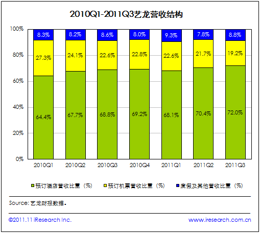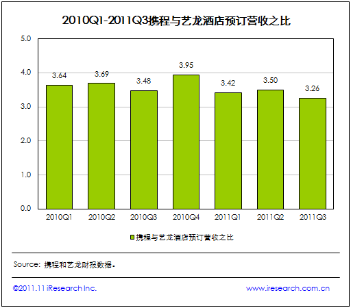 2011Q3中国OTA市场份额最大的携程[注: 携程旅行网品牌创立于1999年,总部设在中国上海,目前已在北京、广州、深圳、成都、杭州、厦门、青岛、南京、武汉、沈阳等10个城市设立分公司,员工近9000人。]网酒店预订营收为4.1亿,是同期艺龙酒店预订营收的3.26倍。从携程与艺龙酒店预订营收之比的趋势上可以看出,艺龙在酒店预订领域与携程的差距正在逐渐缩小。