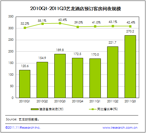 时间:2011-11-22 16:45:42 来源:艾瑞咨询| 11月15日,艺龙发布第三季度财务报告。艾瑞通过整理发现,Q3艺龙总营收1.75亿元,同比增长20.0%,酒店预订[注: 在酒店在线预订方式上,美国有70%的网民会通过互联网在线预订的方式进行酒店预订,但在中国,这个比例仅为15%,市场发展的潜力巨大。]业务营收1.26亿元,增长25.2%,占总营收的72.0%,通过网上及手机预订方式实现的酒店预订在整体酒店预订中的比例进一步提升,接近60%;经营费用为1.08亿元,同比增长20%,其中市场营销费用为6899万元,占比达63.6%;净利润944万元,同比增长718%。 艾瑞咨询认为,艺龙将酒店预订领域作为业务重心,2011Q3无论是在整体业务中的占比和增速,还是酒店预订产品的实际研发和推广上,均有较突出的表现。 2011Q3艺龙总营收1.75亿,同比增长20% 2011年Q3艺龙总营收1.75亿元,同比增长20.0%,环比增长18.0%。艾瑞咨询认为,Q3艺龙通过有力的微博经营,与腾讯、人人网的内容合作,有竞争力的酒店团购,以及PC端、移动终端预订的推广,取得了较好的同比增长率。