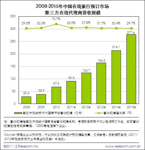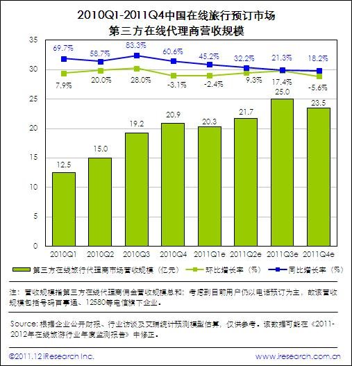 OTA市场营收规模:2011年中国在线旅行预订市场营收规模为90.5亿元,增长33.9% 艾瑞统计数据显示,2011年在线旅行预订市场第三方在线代理商营收规模为90.5亿元,与2010年相比增幅为33.9%,并在后续的四年里保持快速的增长。按季度来看,2011年Q4在线预订市场第三方在线代理商营收规模为23.5亿元,较2010年同期增长18.2%,较2011年Q3环比下降5.6%。 艾瑞咨询认为,在线旅行预订市场第三方在线代理商营收规模的快速增长,一方面得益于消费者日益改善的收入水平和[注: 平和县 位于福建省漳州市西南部,东连龙海、漳浦县,西邻广东大埔,南靠云霄、诏安县,北接永定、南靖县,素有“八县通衢”之称。]出行意愿的进一步显现;另一方面,在线代理商在前者趋势下纷纷推出多种多样的优惠和便捷的预订模式,也在很大程度上刺激了该市场的快速扩大。