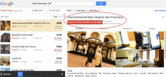 时间:2012-6-6 12:31:20 来源:环球旅讯| 【环球旅讯】Google Hotel Finder推出了新的广告形式Promoted Hotels,该平台优先显示OTA的酒店预订链接,而不是酒店网站。