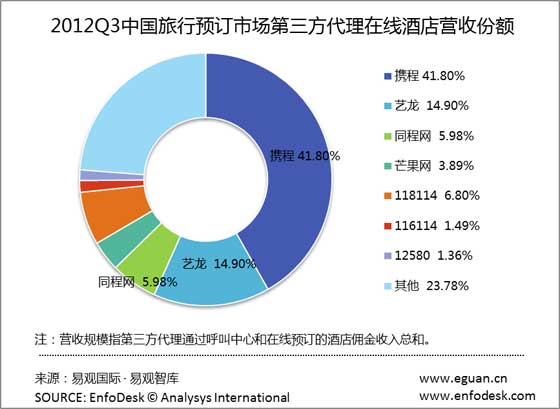 时间:2012-10-29 13:37:13 来源:易观网| 根据EnfoDesk易观智库监测发布数据显示,2012年3季度中国在线第三方代理酒店预订营收规模将达11.7亿元。