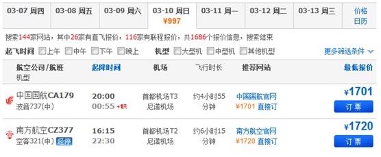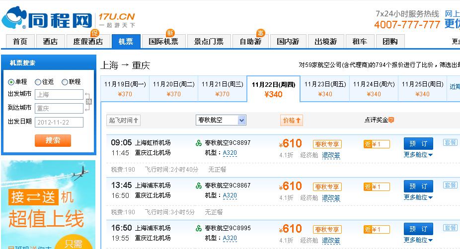 另外一个机票搜索引擎“天巡网”的搜索结果如下: