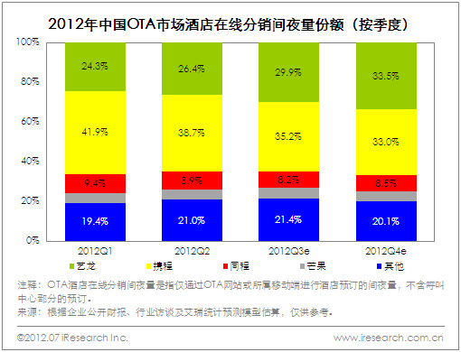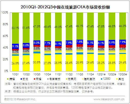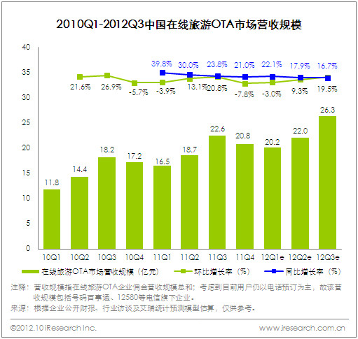 市场营收规模:2012Q3在线旅游OTA市场营收规模达26.3亿,同比增长16.7% 艾瑞咨询统计数据显示,2012Q3中国在线旅游OTA市场营收规模达26.3亿元,同比增长16.7%。艾瑞咨询认为,旅游旺季的到来对OTA营收增长有很大的促进作用,但Q3酒店在线分销的价格竞争在一定程度上削弱了营收增长的幅度。