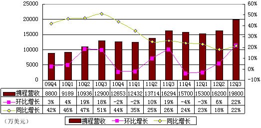 携程第三季度营业收入为12亿5000万元(1亿9800万美元),同比增长20%。2012年第三季度总营业收入环比增长21.5%。