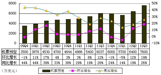 携程第三季度机票预订营业收入为4亿7800万元(7600万美元),同比增长24%,环比增长18%,增长主要来源于机票预订量增长。