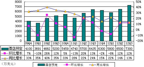 携程第三季度酒店预订营业收入为4亿5700万元(7300万美元),同比增长11%,增长主要来源于酒店预订量40%的同比增长,并被每间夜收入21%的同比下降部分抵消。每间夜收入的同比下降主要受促销活动的影响。酒店预订营业收入环比增长11%,主要受季节性因素影响。