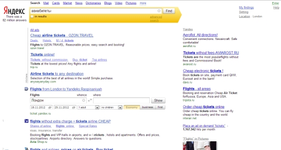时间:2012-11-19 11:37:01 来源:环球旅讯| 【环球旅讯】俄罗斯在线旅游领域又有大动作——俄罗斯最大的搜索引擎Yandex在其搜索结果页添加了航班搜索框,旅行者可以在最热门的一些关键词的搜索结果页面上看到这个搜索框。 总部位于俄罗斯的Yandex拥有60%的搜索市场份额,它将航班搜索框放在了如机票(每月的搜索量为120万次)、在线机票和购买机票等关键词的自然搜索结果之上。