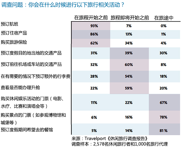 Travelport还询问受访者是否会通过社交媒体分享他们的旅行计划,在35岁以及35岁以下的旅行者当中,73%的旅行者称其很有可能采取上述做法;而在36岁至45岁的旅行者当中,通过社交媒体分享旅行计划的旅行者所占比例下降至55%。 另外,45岁以上的旅行者当中,仅有36%的旅行者会通过社交媒体分享旅行计划。 而在旅行者旅行前希望通过手机获得哪些信息这一问题,35岁以及35岁以下的旅行者以及36岁至45岁的旅行者都表示他们最希望获得有关景点、最新天气情况、餐厅和休闲娱乐的信息。 45岁以上的旅行者也希望获得有关景点和最新天气情况的信息,但他们并不太关注有关餐厅和休闲娱乐的信息。 35岁以及35岁以下的旅行者以及36岁至45岁的旅行者依然会向旅行代理寻求服务,其中超过50%的旅行者称其依赖于线下代理,2/3的旅行者则称其依赖于在线代理。年轻的旅行者也表示,他们在计划一些复杂的行程时较可能向旅行代理寻求服务。 该年龄段的旅行者还强调,网络上大量的信息会使他们感到困惑。 该调查报告还发现,旅行者所收到的行程计划中所获得的信息与他们真正想要获得的信息之间存在着差距。其中68%的旅行者称其想要获得有关折扣产品的信息,65%的旅行者称其希望获得更多有关餐厅的选择,65%的旅行者称其希望获得更多有关机场内以及机场附近的提款机和外汇兑换服务的信息。 另外,旅行代理则称其使用的系统缺乏发送提醒信息、信息更新和提示信息的功能,他们还希望能获得更好的报表工具,让他们可以更好地服务顾客。 调查结果还显示,旅行者在旅程中会对特定的元素进行管理,例如餐厅预订和当地旅行活动产品。