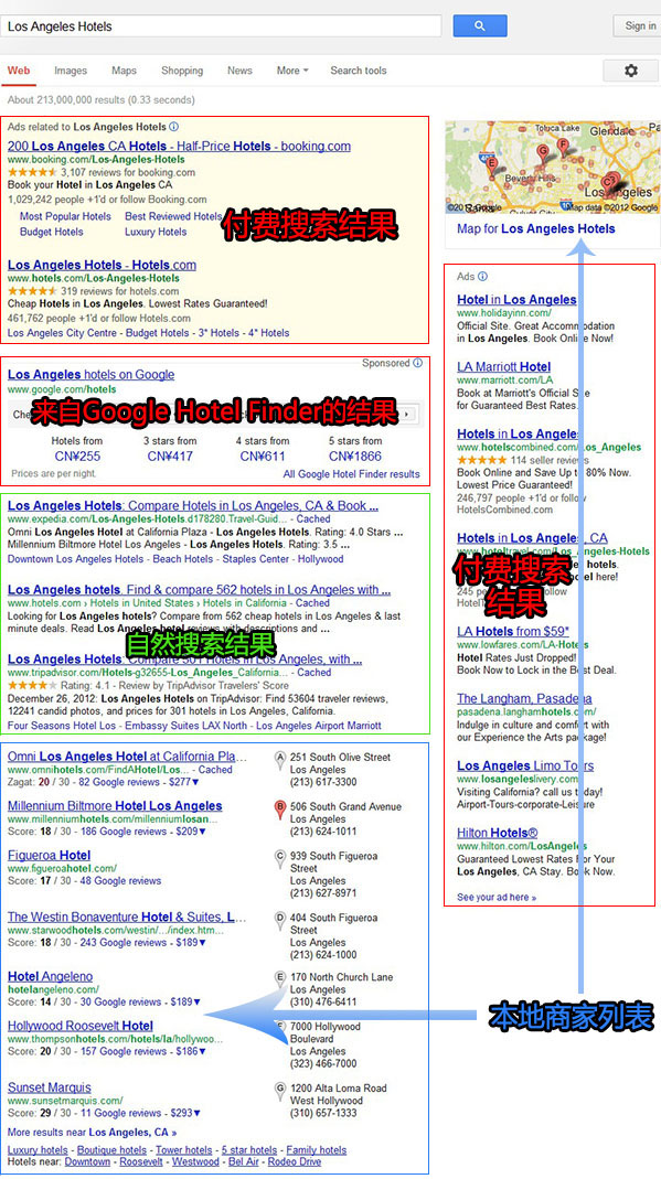 时间:2012-12-29 16:16:12 来源:环球旅讯| 【环球旅讯】注:这篇特邀文章的作者为SEO代理商Ayima的Stephen Massart、Ryan Huser和Adam Whittles。 我们公司会对搜索相关的各种问题进行深入的分析,之前我们收到了某位Tnooz读者的爆料,他/她提到Google在最新推出的安卓系统(Jelly Bean)设备上所显示的搜素结果与其在传统网站上显示的常规搜索结果并不一致,我们认为应借此机会探讨一下移动搜索领域,更确切的是,我们要针对用户在进行“获取本地信息的倾向”(Local Intent)搜索时会获得什么样的搜索结果进行分析。 在分析上述主要问题之前,我们先对一些术语作出清晰的解释。“获取本地信息的倾向”(Local Intent)指的是当某位用户输入的搜索内容使得Google假设其更倾向获取本地信息的搜索结果,因此居住在芝加哥的用户在输入“西雅图的餐厅”时,他们实际上是希望通过搜索来获取有关西雅图的本地信息。下面我们来看一下当用户在使用电脑输入“洛杉矶的酒店”时,Google网站的搜索结果页面会返还哪些信息。