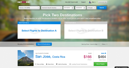 创业孵化器Y Combinator曾为该初创企业提供支持,一些投资者也在为它提供资金,包括互联网社区Reddit的联合创始人Alexis Ohanian、俄罗斯企业家Yuri Milner以及Digital Collective和Lightbank等私募基金。 GetGoing面临着一个困难,那就是如何通过快速和简单的方法来推介其概念,即“选择两个目的地,支付其中一个目的地的机票,且购买的是由该平台所提供的机票”。与Priceline在1999年向新用户推介其概念相比,GetGoing推介上述概念的过程可能更为复杂。 为了解决这一问题,该公司希望成为业内首个通过提供旅游灵感来成功转化访客的工具,“类似于旅游业中的潘多拉”。 (Wing 编译) |