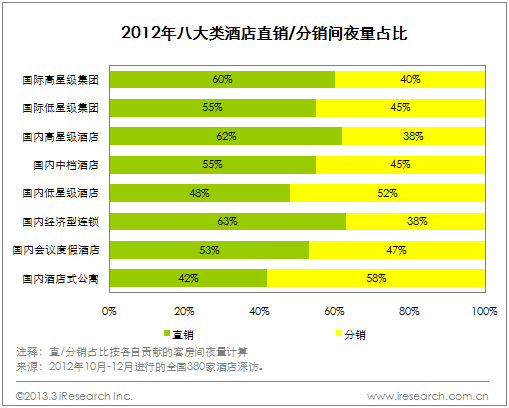 时间:2013-3-28 12:36:45 来源:艾瑞网| 近日,艾瑞咨询发布《2012年中国酒店销售渠道研究报告》。2012年全国酒店客房销售渠道中,通过直销和分销售出的间夜量分别占55.1%和44.9%。总体而言,直分销渠道销量占比均衡,直销比例略高。进一步分析,酒店销售渠道呈现以下三大特点:1、直销各渠道以协议客户为主,分销渠道销量以OTA为主;2、不同类型酒店销售渠道差异化显著;3、新型模式仅为补充渠道,酒店态度偏谨慎。 直销以协议客户为主 分销渠道销量以OTA主导 酒店直销各渠道中,协议客户销量占比最高,占直销渠道的37.1%,这部分销量主要来自企事业单位和公关会展公司;排在后边的渠道依次是自有会员、前台散客和自有预订系统,共占直销渠道的58.2%。此外,业主预留房、出租车大巴送客、搜索引擎推广等贡献少量销量,占比为4.7%。 分销渠道以OTA和旅行社团客为主,其中:OTA地位显著,占分销总量的65.1%;旅行社团客是第二大分销渠道,占比26.5%;分销新型模式占比为7.7%;GDS仅占0.7%。