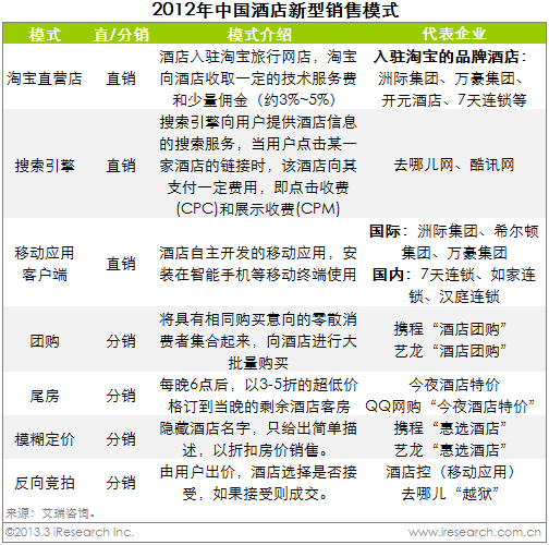 新型模式仅为补充渠道 酒店态度偏谨慎 近年来,市场上出现众多酒店新型销售模式。直销新模式主要有淘宝直营店、搜索引擎营销和移动应用客户端三种模式。分销新模式有团购、尾房、惠选和反向竞拍等。 上述新型模式一经推出便引起市场反响,用户体验需求较强。以团购为例,团购在酒店行业中普及速度最快,低价销售模式更易吸引中低档、经济型连锁等面向价格敏感型人群的酒店开展。另外,尾房模式主要在国内中低档酒店和酒店式公寓中应用更多。与前两种模式不同,惠选模式帮助酒店"埋名"销售剩余客房,更多应用于中高档酒店。 然而,酒店方面对新模式尤其是分销新模式大都持谨慎态度。新模式的确可以帮助酒店消化剩余客房,提高出租率;不过酒店获得的利润较低,客源不稳定,仅作为一种补充性渠道。