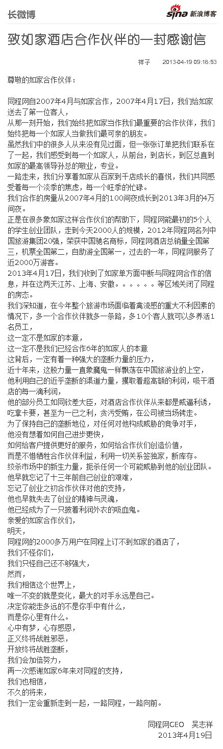 时间:2013-4-19 11:33:00 来源:环球旅讯| 【环球旅讯】4月19日消息:同程网CEO吴志祥在微博发布《致如家酒店合作伙伴的一封信》,表示从4月20日起,同程网用户将无法在同程上预订到如家的酒店。