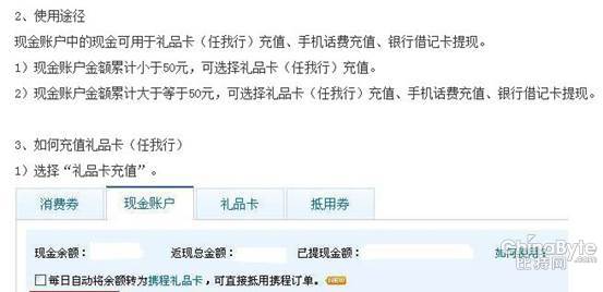 分析:三家网站所有抽样票种的门票卖价相同,比如“上海东方明珠2球联票”,三家网站的卖价都是145元,携程返现17元,驴妈妈返现10元,同程返现5元。“千岛湖中心湖区门票”,三家网站的卖价都是175元,携程返现15元,驴妈妈返现10元,同程返现2元。三家网站返现力度的排序是:携程旅行网>驴妈妈旅游网>同程网。 所谓“返现”,顾名思义是“返还现金”,因此返现离不开“提现”这一环节。记者深入调查发现,三家网站都对返现设置了各不相同的提现门槛。记者截取了三家网站关于提现门槛的条款页面图片(截至2013年4月28日16:00): 驴妈妈旅游网: