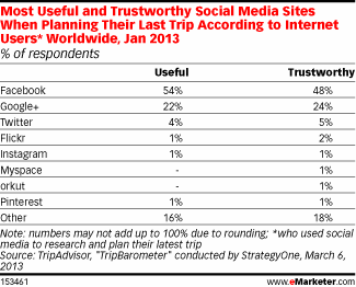 此外,22%的受访者称他们认为Google+是其旅行计划过程中最有用的社交网络。相比之下,仅6%的旅行者称他们认为Twitter、Pinterest和Instagram是其旅行计划过程中最有用的社交网络。