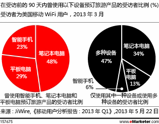 时间:2013-7-16 16:58:28 来源:环球旅讯| 【环球旅讯】越来越多人通过平板电脑和智能手机来预订旅游相关产品 移动设备在美国的渗透率不断提升,与此同时,这些设备在旅游者中的使用率也在提高。据eMarketer估计,2013年,在通过数字渠道调查旅游产品的消费者当中,40%的消费者将在平板电脑或智能手机上进行旅游计划;而在通过数字渠道预订旅游产品的消费者当中,超过25%的消费者将会通过移动设备完成预订。 移动广告平台JiWire对1,200多名美国网民进行了调查,结果证明,在2013年的第一季度,消费者通过各种设备来调查旅游相关产品和进行购买,这些产品包括酒店、航班、餐馆和娱乐活动。在受访的美国移动WiFi用户中,将近一半的受访者会在智能手机和平板电脑上研究旅游产品,27%的受访者会在智能手机上预订旅游产品,而使用平板电脑预订旅游产品的受访者比例为39%。