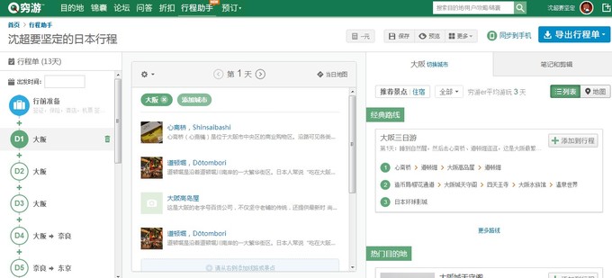 时间:2013-8-21 13:39:38 来源:36氪| 景点、换乘、住宿、餐饮、注意事项,是很多为异地旅行做计划的时候总会遇到的一连串问题。穷游新推出的行程助手希望通过把旅行线索串联起来,并基于海量游客的经验为用户规划旅行中的细节,来为出境游客作出便利的旅行规划。 点击创建行程,经历从大洲、国家到城市的选择,系统会自动生成一个基于城市的旅行排期,用户可以根据需要进行个性化微调。