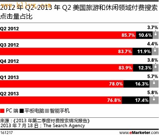时间:2013-10-20 22:21:38 来源:环球旅讯| 【环球旅讯】旅游企业在2013年加大对新兴渠道的广告投入 吸引潜在旅行者是广告商一贯的做法,旅客在下单前一般都会从多个渠道和多家网站获取灵感,随着各种数字设备和平台的不断增多,选择广告发布的渠道对广告商而言十分具有挑战性。 旅行者往往是最早使用数字设备的群体,他们从正在增长中的渠道(例如手机和数字视频)获得广告信息的行为就是证明。The Search Agency的“2013年第二季度付费搜索情况报告”提到,2013年第二季度,在旅游和休闲领域的付费搜索广告中,平板电脑和智能手机的点击量占比同比增长了超过60%。