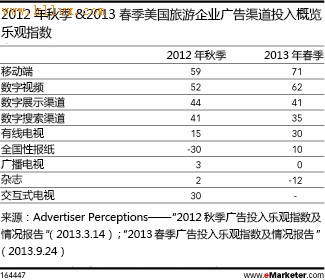 营销人员正针对这些潮流推出相应策略。Videology的数据表明,2013年的前两个季度,旅游业在视频广告领域所获得的市场份额明显增长,从3.2%上涨到了5%。另外,Advertiser Perceptions针对美国广告商做了一次半年调查,并采用了一种“乐观指数”来评价在调查期间增减广告预算的受访者比例。根据2013年春季的指数,计划增加移动和数字视频预算的旅游广告商分别占到71%和62%的指数值,这要远远多于计划减少的广告商。