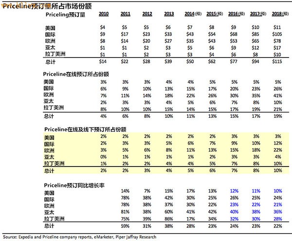 时间:2014-04-23 09:44:51 来源:环球旅讯 【环球旅讯】Priceline以610亿美元的市值超过598.5亿美元的拉斯维加斯金沙集团(Las Vegas Sands),成为全球市值最高的旅游公司。 然而,该公司上个月的股价却无缘无故地下跌了15%,Priceline现在是否还有发展空间呢?投资银行Piper Jaffray在4月15日给客户的投资简报中对此问题进行了分析,阐述了他们认为Priceline前景依然强劲的原因。这些原因归纳为一个词:全球化。 分析中提到,在线旅游有两大全球化趋势,而两者都是对Priceline有利的:1)全球日益增长的在线预订渗透率;2)越来越多的旅游线上广告投放。Priceline 85%的预订为国际预订(即美国境外预订),收购元搜索引擎Kayak能够让该公司在线上广告方面取得发展。 以下是PJC对Priceline的前景预测,听起来也不无道理: 目前Priceline在全球旅游市场的份额只有4%,其亚太地区(Agoda)和拉丁美洲地区 (Booking.com)的业务正在快速增长。我们相信,这两个地区的发展会在接下来的两年里将Priceline的国际旅游预订量增长带动到25%以上。 根据Expedia和Priceline的公司报告,亚太和拉丁美洲的旅游市场加起来(3800亿美元)比美国市场(3100亿美元)要大。此外,前两个地区的发展也更为迅速。我们还注意到,Priceline的欧洲业务远未成熟,有望在Booking.com的带动下增速达到20%以上。Expedia和Priceline的公司报告称,欧洲旅游市场规模约为3250亿美元,而据我们估计,Priceline在其中所占份额仅为8%。简而言之,我们认为在未来的10-20年里,Priceline还有很大的发展空间。 下图显示了Priceline在各地区以及全球旅游预订市场所占的份额。随着旅游预订趋于线上以及该公司全球业务的开展,还有大把的机会在等着Priceline。(Sylvia 编译) |