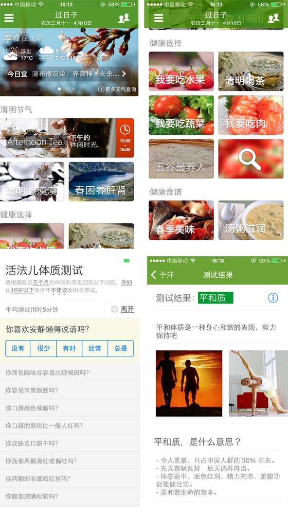 最后,要给吃货们推荐一款健康饮食的APP,不要觉得这个名字很土鳖,人家可是很专业的健康管理团队,出品方活儿法网之前还有的产品有:《颈椎, 你好》、《胃,你好吗》以及《眼睛,你好》 过日子内置了由软件开发商推出的中医体质测试,感觉还是挺靠谱的。事实上早在2010年初,过日子iOS 客户端推出一年半之前,一个叫活法儿体质测试的东西就开始风靡中国网络,他们第一次以《中医体质分类与判定》为标准来把体质测试搬到网络, 后来很多网站都 跟风推出了体质测试。而今活法儿体质测试融入到移动APP,做得也是非常成功,甚至有人直接称《过日子》为体质测试APP。通过与淘宝的合作,已为800万淘宝用户提供了个性化的健康生活服务,测试答题的过程也相当于有趣,虽然共有60题之多,但是完成过程居然不会让你感到无趣,“你阴囊部位潮湿吗”“”赶紧给你身边的朋友们一起测测吧 测完体质后, 过日子会给你定制每日生活宜忌:根据节气、体质、性别、年龄、病症,提供细化的生活饮食提醒 而且不同的时间,过日子给你不同的关心,中午打开过日子,你可以使用摇一摇功能,摇出你的午餐健康元素。下午3点后打开过日子,你可以看到下午茶专题,祝你在放松中找到新的灵感。 |