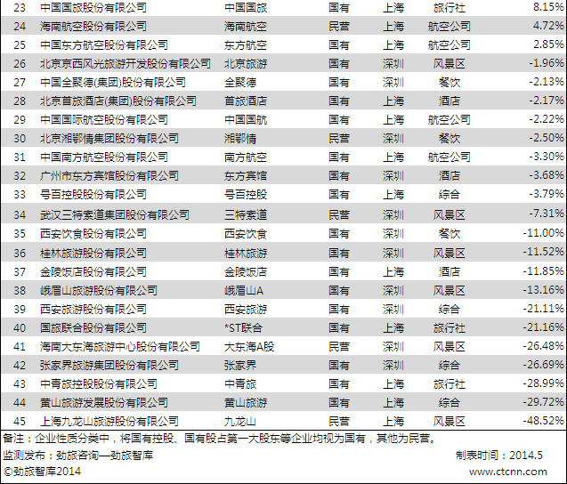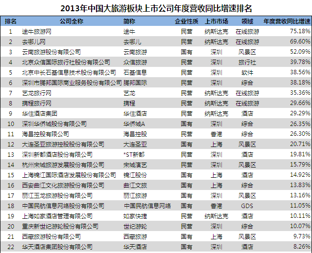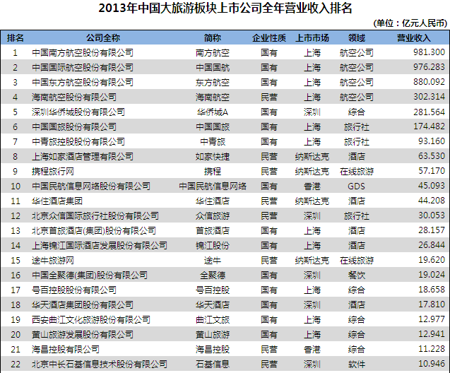 时间:2014-06-20 09:51:24 来源:不详 近日,由国内专业旅游财经新媒体网站劲旅网,根据中国大旅游板块(旅游、交通、酒店、餐饮)上市企业(包含在国内A股、港股和美股)发布的2013年度财报,将其中的45家相关企业从全年营收、营收增长速度以及净利润三个维度进行比较分析,得出全年营收排名、增长速度排名以及净利润排名。 从全年营收统计 排名前十位的分别是南方航空、中国国航、东方航空、海南航空、深圳华侨城、中国国旅、中青旅、如家、携程以及中国民航信息网络,华住酒店排名十一,民营上市的旅行社众信旅游营收30.035亿排名十二。国有控股企业依然在大旅游类上市公司中拥有相当的优势,四大航空公司因其享受的资源稀缺性独占鳌头不足为奇。另外,深圳华侨城以其庞大的产业版图占据第五名的位置也在预料之中,值得一提的是如家、携程和华住这三家在美股上市的民营企业,同时跃入前十一。值得一提的还有第十二名的众信旅游,作为刚刚上市的民营旅行社,是不错的成绩。 全年营收在100亿以上的共有六家,除了四大航之外是华侨城和中国国旅两家央企;全年营收在10亿-100亿之间共有17家,其中8家国企、9家民企,和酒店相关的企业达到9家;全年营收在5亿以下的大部分是景区类公司,该类上市公司如何发挥资源优势,精耕细作目的地,进一步整合好资源,仍有相当大的空间。