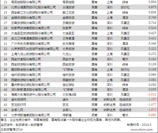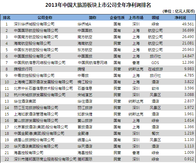 从净利润收入统计 排名前十分别是深圳华侨城、中国国航、南方航空、海南航空、东方航空、中国国旅、中国民航信息网络、携程、中青旅和锦江股份义。和全年营收相同,绝大部分是国有企业,只有携程和海南航空两家民营企业跃入前十。携程作为在线旅游行业老大,盈利能力仍然较强。 排名后十位的有三家都是在线旅游企业,同为在线旅游企业的途牛、艺龙和去哪儿和携程在净利润收入方面差距较大。另外主营业务为景区的公司在后十位里也占比33%,每家净利润均低于1000万,处于盈亏边缘或亏损。 必须提的一点是,工商银行2013年实现净利润高达2629.65亿元,按一年365天计算,其每天创造的净利润就有7.2亿,45家大旅游板块上市公司全年净利润的总和为228.832亿元,仅相当于工商银行31.78天创造的净利润.中国国航全年净利润36.699亿元,相当于工行5天的利润;携程旅行网全年净利润9.983亿元,相当于工行1.4天的利润。