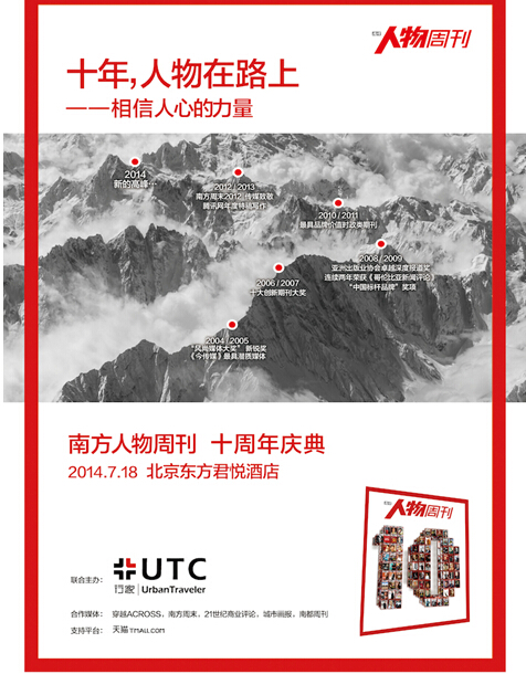 十年,人物在路上,由UTC行家鼎力支持的“南方人物周刊”创刊十周年庆典开幕在即,与十年风云人物,面对面,我们期待与您的见面,期待与您的分享!