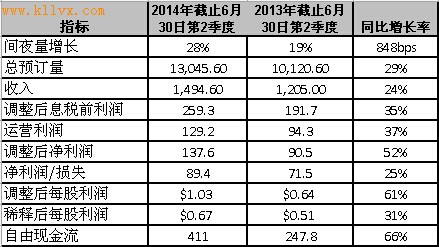预订量、收入和收入利润率 第二季度预订量同比增长了29%(扣除汇率影响为28%),主要是由于酒店间夜量及机票销售量增长所拉动。酒店间夜增长主要由Expedia品牌包括Travelocity品牌网站、Hotels.com和艺龙网的增长所拉动。机票业务增长主要由Expedia品牌,包括Travelocity品牌的网站业务所拉动。 第二季度的国内预订量同比增长了35%,国际预订量同比增长了21%(扣除汇率影响为19%)。国际预订量达到了52亿美元,占全球总预订量的比例由去年同期的42%下降到了40%,这主要是由于将Travelocity品牌的美国网站业务量计入国内预订量所导致。 收入同比增长了24%(扣除汇率影响增长为22%)。国内收入增长了19%,国际收入增长了30%(扣除汇率影响增长为25%)。国际收入7.06亿美元,约占全球总收入的47%,去年同期为45%。 第二季度收入利润率(收入与总预订量的比率)为11.5%,同比下降了45个基准点。 产品与服务 酒店收入占了全球总收入的71%,机票业务占9%,广告和媒体收入占8%,其它业务收入占13%。 第二季度全球酒店收入同比增长了23%,主要是由于酒店入住间夜数同比增长了28%,但每间夜平均收入则下滑了4%。 全球机票收入同比增长了22%,主要是由于机票销售数量同比增长了28%所带动,但每张机票平均收入下滑了5%。 广告和媒体收入同比增长了54%,主要是由于trivago和Expedia自身的业务增长所拉动。 其他收入同比增长了15%,主要是由于旅游保险和租车业务的收入增长所带动。 业绩概要 全球业务 ·Expedia签署了澳大利亚在线旅游公司 Wotif.com Holdings Limited的收购协议,现金交易金额为7.03亿澳元或每股3.30澳元(合6.58亿美元或每股3.09美元)。 ·Expedia停止了对欧洲租车公司Auto Escape Group的收购,后者将与CarRentals.com共同构成Expedia的全球租车业务。 ·Egencia在全球扩大了服务范围,在迪拜、埃及、新西兰、乌拉圭及阿尔及利亚新增了加盟合作伙伴,在捷克推出在线服务。 ·Egencia在全球签署了新的客户,其中包括化妆品公司欧莱雅美国公司、顶级拳击推广公司Top Rank Inc。 ·Hotels.com首次获得戛纳国际创意节铜狮奖,全球共有37,000名参赛成员,仅有3%获奖。 ·Tri |