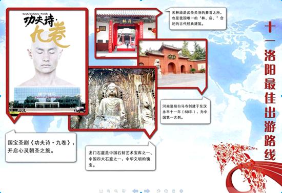 圣城洛阳黄金三角:龙门石窟、白马寺、国学剧院 十一长假即将来临,洛阳市作为著名旅游城市,也将迎来众多中外宾客。和往年不同的是,今年十一,外地游客去圣城洛阳旅游又有了一个新的去处——去国学剧院看国 宝圣剧《功夫诗·九卷》。游客可以在白天游览龙门、白马寺、关林等景点后,晚上坐到装饰典雅的国学剧院看国学修行剧,让自己的心灵沉静下来,给自己的心灵 洗个澡。