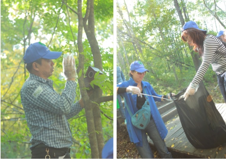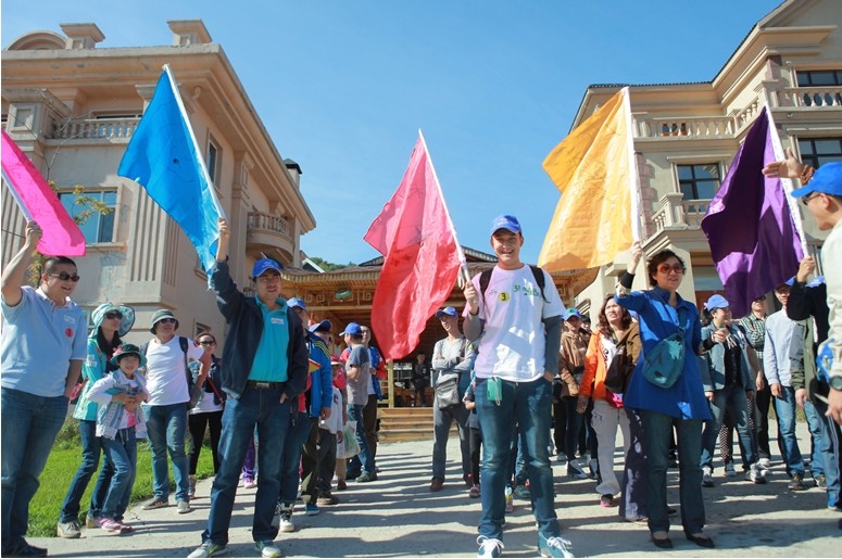 在享用完正宗浓郁的东北风味的午餐后,所有嘉宾在拓展教练的号召下,趣味而生气地完成了五个小队的分组。在每组队长的带领下,大家分组深入到金龙山国家森林公园进行环保任务的拓展。金龙山国家森林公园位于哈尔滨市长江南路48公里处的金代发祥地阿城区境内,其主峰海拔826米,是哈尔滨第一高峰。公园以森林景观为主体,以苍山岩壁为骨架,以清泉溪流为脉络,古迹人文点缀其间,形成了“奇山、怪石、古树、林海、文物、山泉、动植物”为独特秀丽的风景。栈道两侧,丰富的野生药材、菌类、奇花、灌木等植物资源遍布其地,时不时地还会有小松鼠突蹿于眼前,让人感觉古朴神秘、返朴归真。倘佯于林海间,大口地呼吸着新鲜的空气,尽览眼前醉人美景,仿佛到了人间仙境……由于纬度高、霜期早、霜度强等原因,九月底金龙山的红叶景观已经初现:红叶初红点缀林间,更突出了金龙山的清秀之美,别具风格。