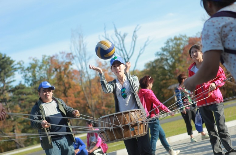 到达主峰的观景平台后,本次活动的环保任务“环保时装秀”将现场气氛推向了高潮。每一个队伍都利用手中相同的废旧报纸、彩色拉纸、垃极袋等环保材料,发挥自己对环保与设计的创意想象,现场在有限的时间内设计并展出一套时装作品,并赋予作品一定的环保主题,阐述对生态与环境保护的重要意义。瞬间,主峰观景平台便临时变成了一个森林“秀场”,家庭档、亲子档、情侣档,队员中不乏一些创意和设计奇才。其中有一组60多岁的老夫妇展示的情侣装表演,俩人像模像样的表演范儿活跃了现场气氛,大家欢快的笑声响彻空静的山谷,吸引许多爬山的游客连连驻足,一起融入我们的环保活动之中。而为了充分调动大家的团队合作精神而特别设计的“击鼓颠球”环节,让一群相互不认识的人紧紧团结在了一起。一个栓有十多根绳的大鼓,在众人的牵拉下将一个排球不断颠起,弹跳的时间越长,相应的团队便胜出。现场大伙儿热火朝天的那种专注与激情,不是比赛却胜似比赛。