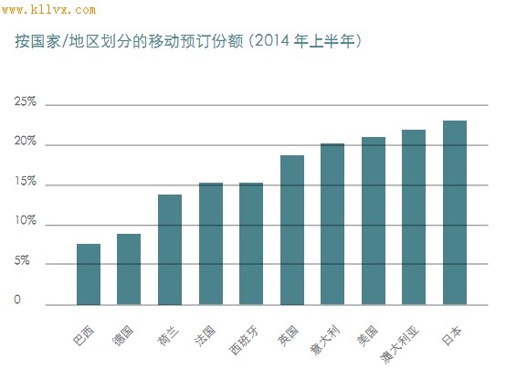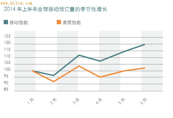 亚太地区以超过20%的移动端旅游预订率领先全球,而巴西和德国的该比率不到10%; 拉美地区旅游网站的在线预订季节性增长最为显著,增长率达到42%;这是由于巴西在2014年举办国际足联世界杯拉动的。 欧洲和美国的在线旅游社的预订单量增长了50%,但其平均预订额度下降了19%。对于酒店经营者而言,2014年上半年的预订量保持稳定,并在2月和6月出现高峰。